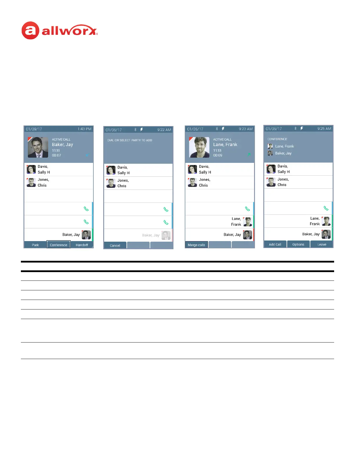 * When dialing additional conference call participants, Allworx users can press the Contacts function button to select the
