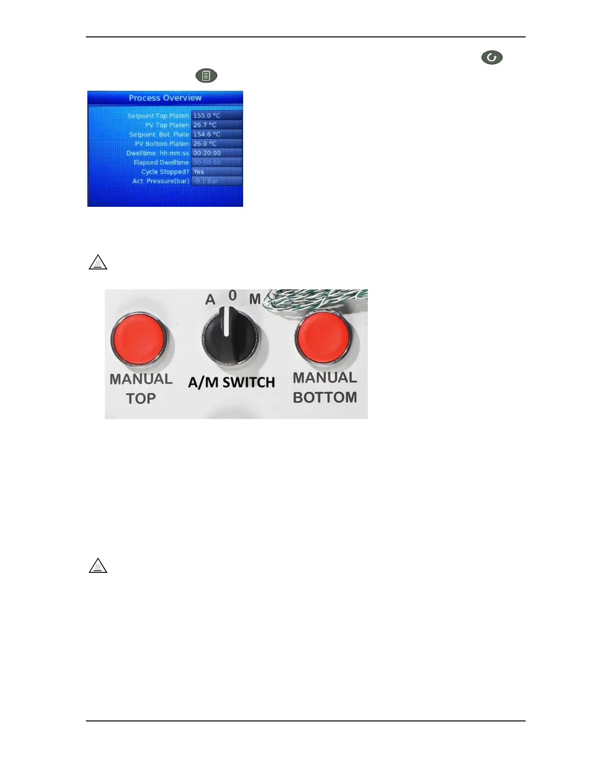 M - On Manual. Override temperature controller and switch power to platen on. After having set the