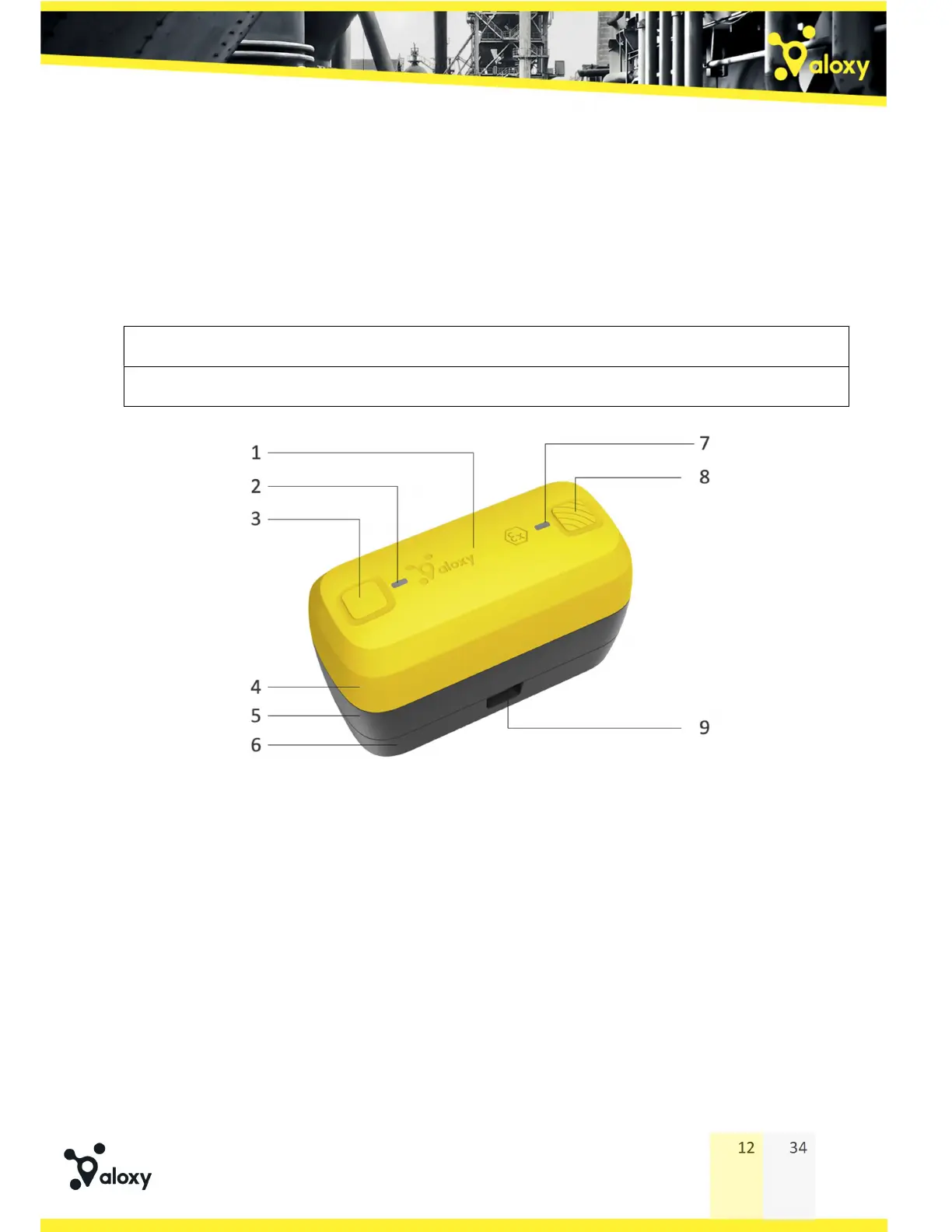 1. Aloxy logo, Ex marking & NFC area: The Aloxy logo indicates the area of the Aloxy Pulse device that