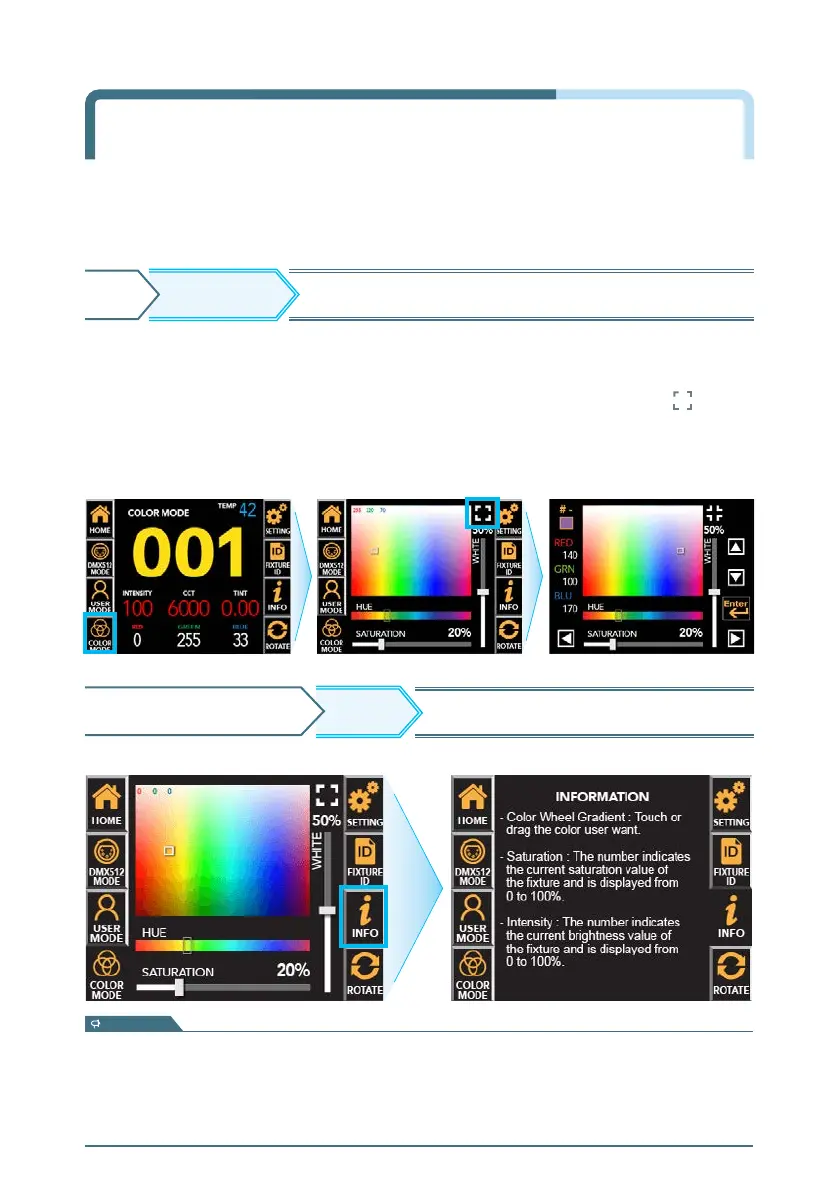 - Saturation : The number indicates the current saturation value of the fixture and is displayed from 0 to 100%.