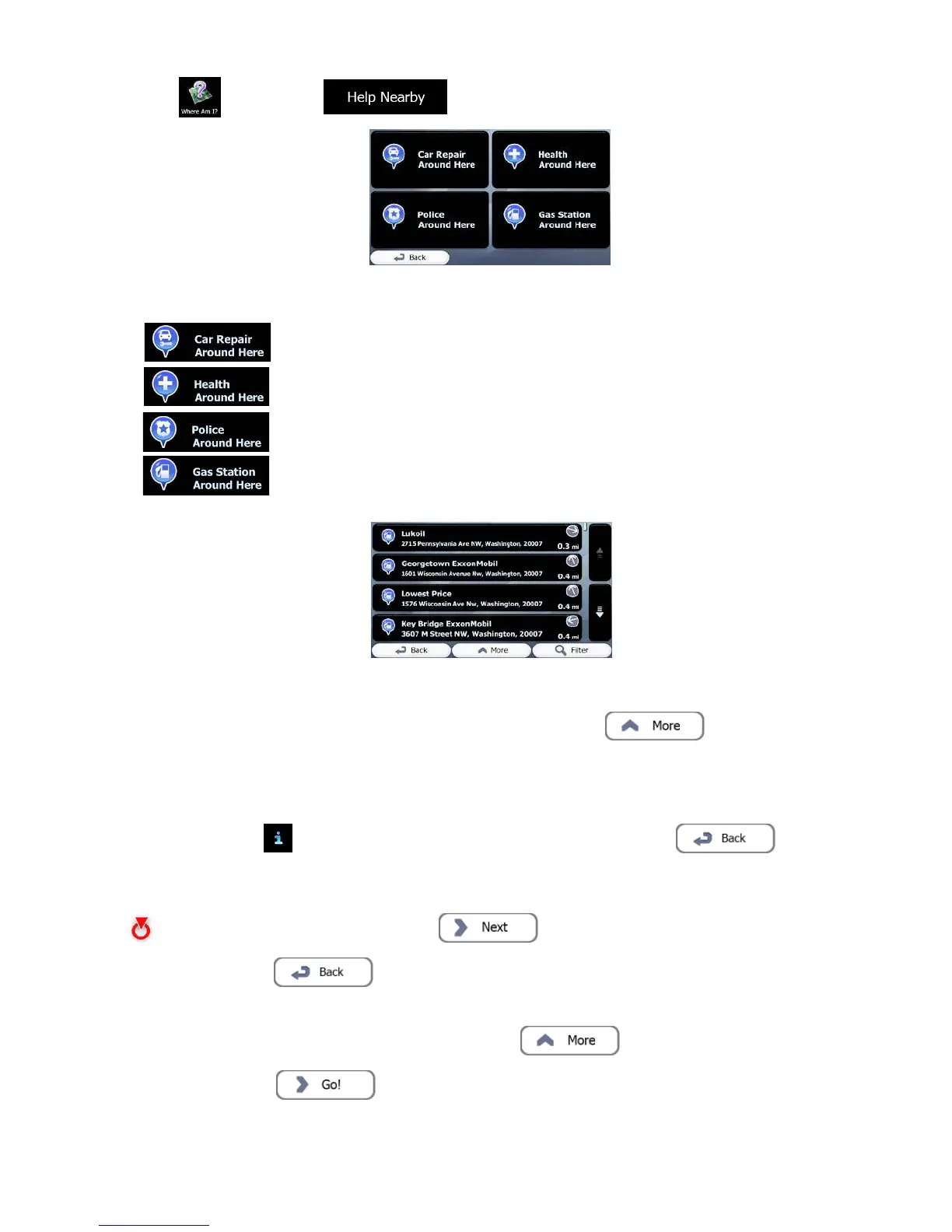 3. Preset search categories appear, all for searching around the current position (or