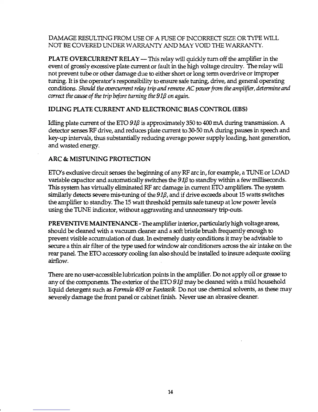 any of the components. The exterior of the ETO 91/3 may be cleaned with a mild household