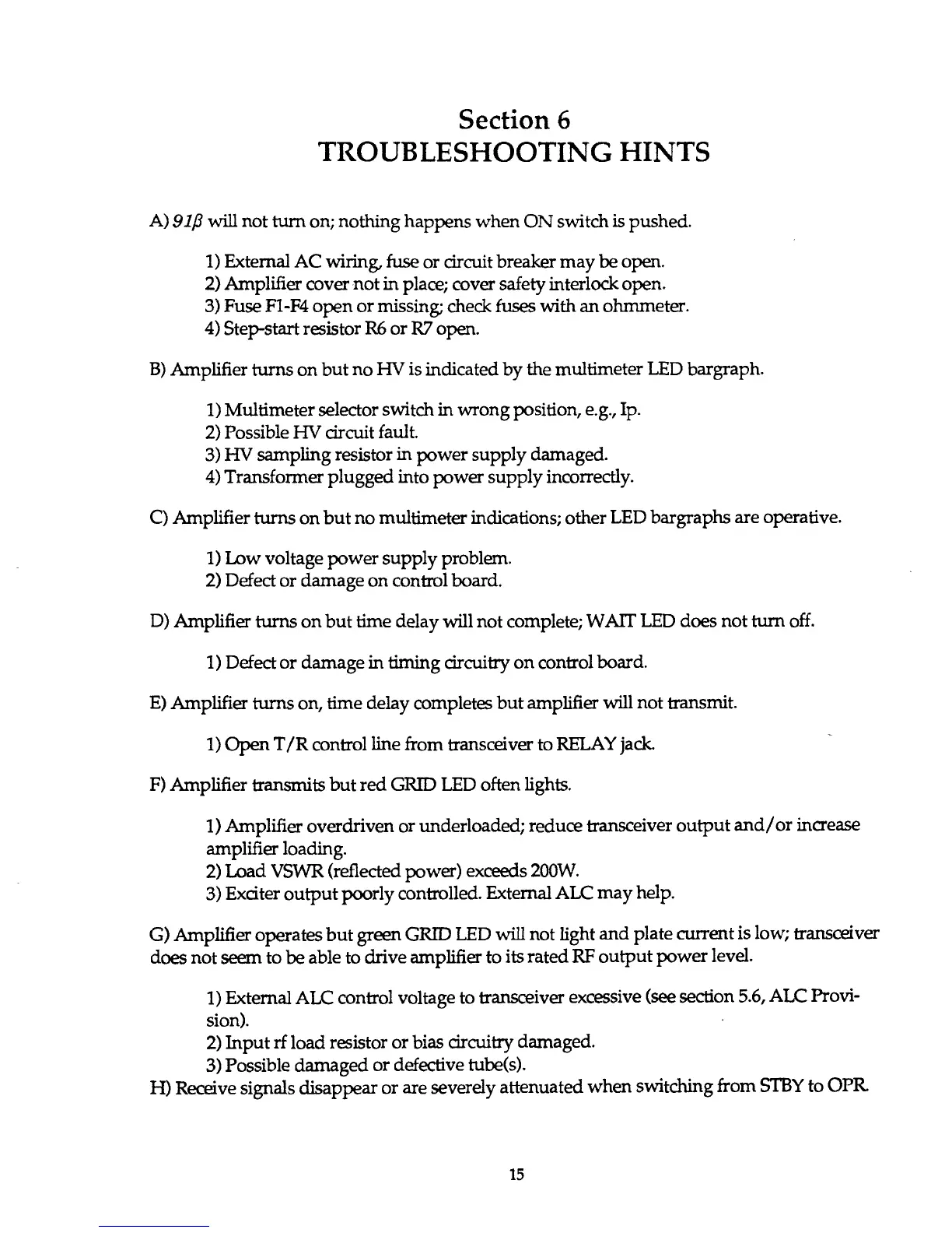 G) Amplifier operates but green GRID LED will not light and plate current is low; transceiver