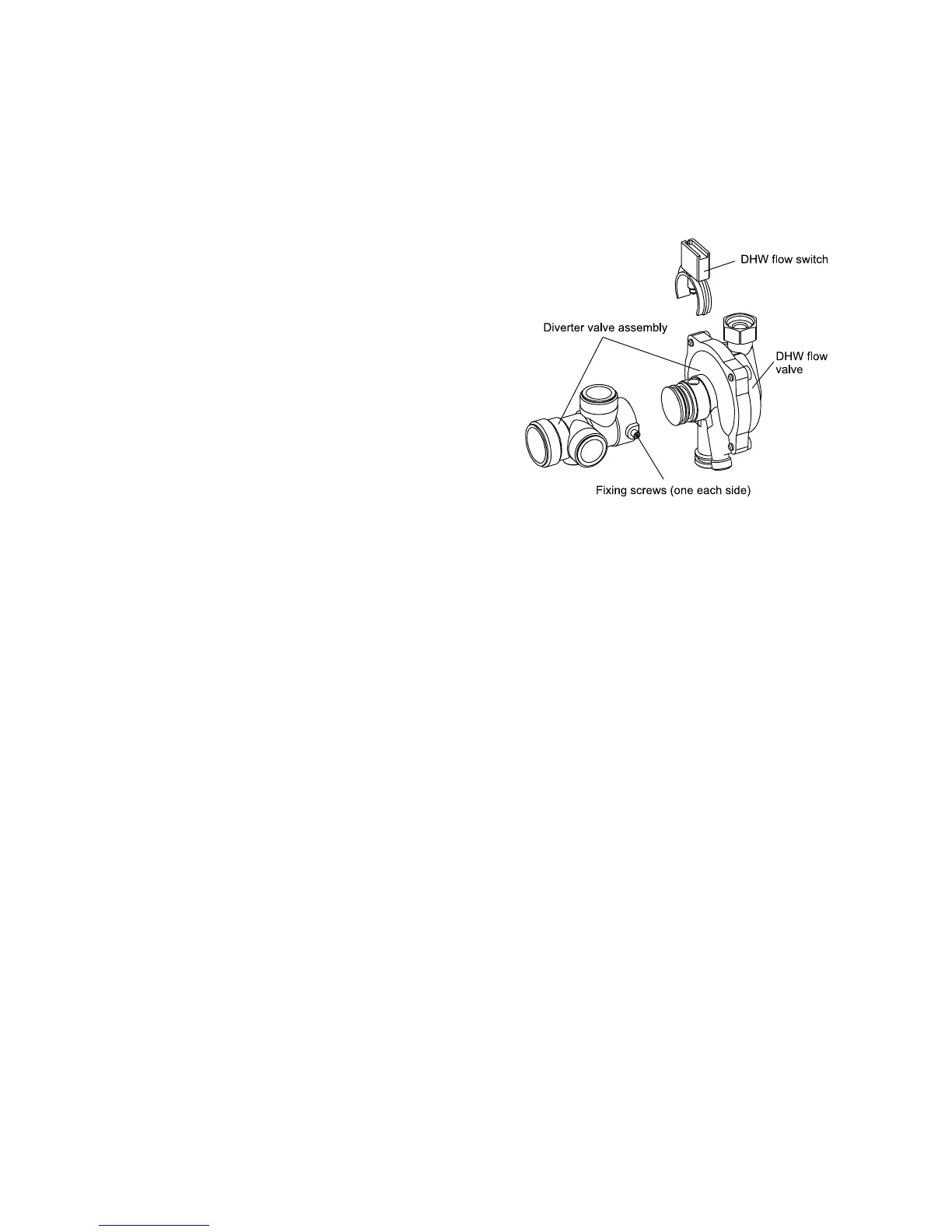 2. Unscrew (not necessary to remove) the two screws securing the DHW flow valve to the diverter valve and withdraw the valve.