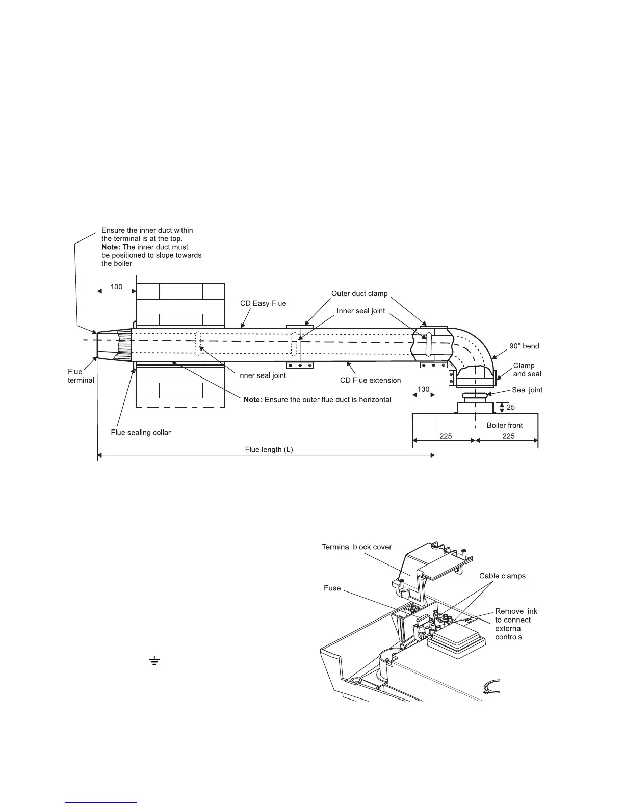 Note: Check the flue terminal protrudes 100 mm out of the wall and that the inner duct of the terminal is positioned