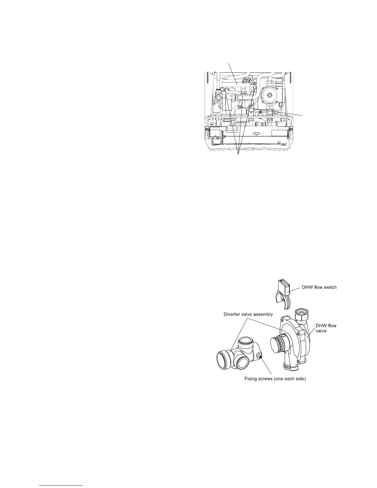 2. Remove the domestic hot water heat exchanger and flow switch assemblies from the diverter valve as described in