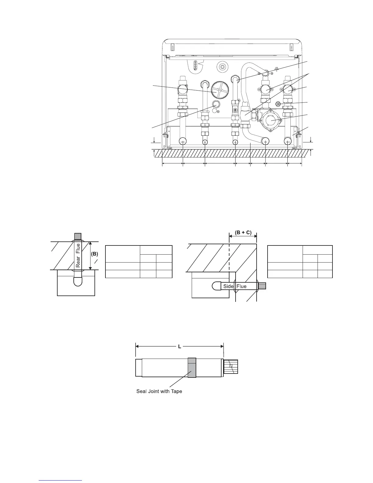 Side flue L = wall thickness (B) + distance between boiler and wall (C) + 120 mm