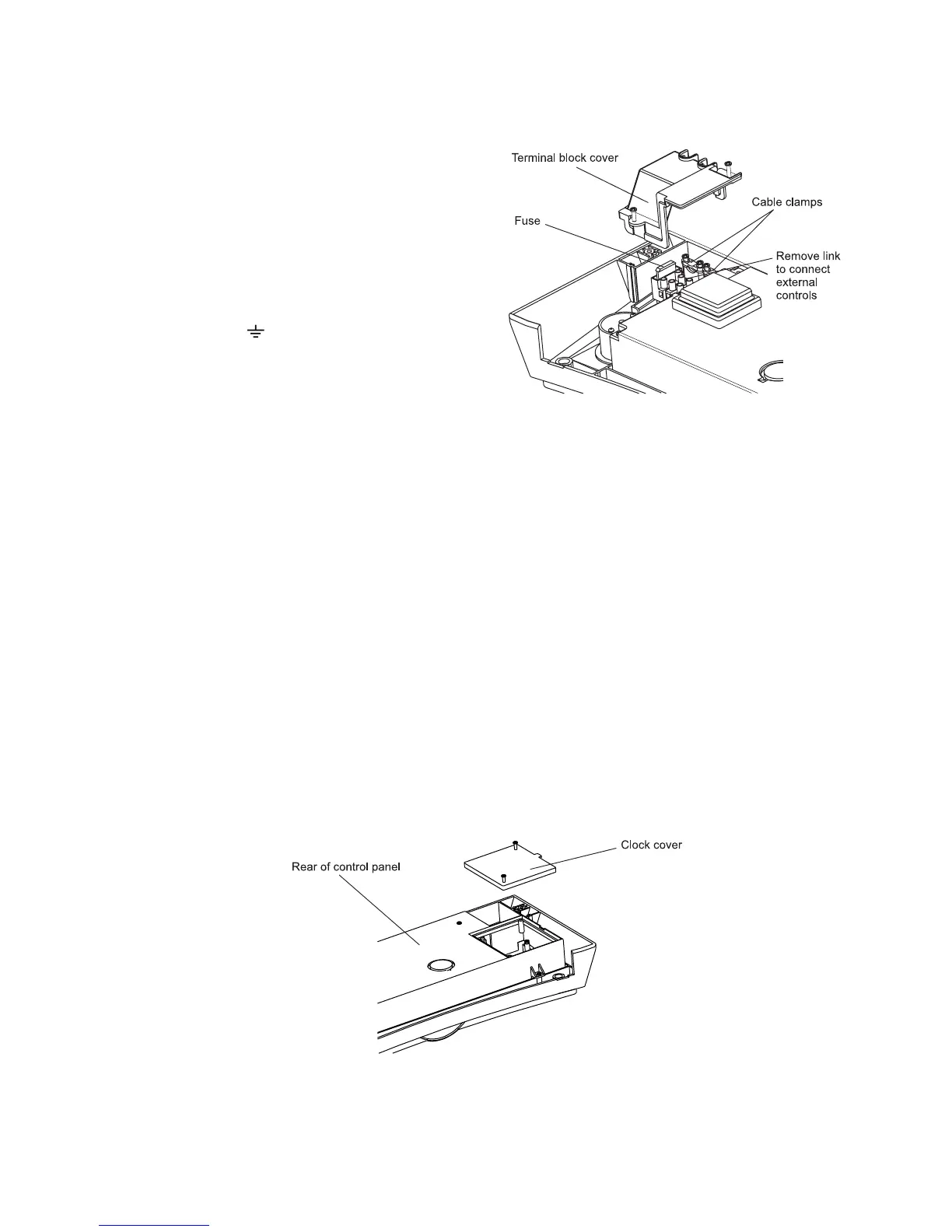 3. If an external control, i.e. room thermostat or external clock is to be fitted, remove the terminal block cover and remove the