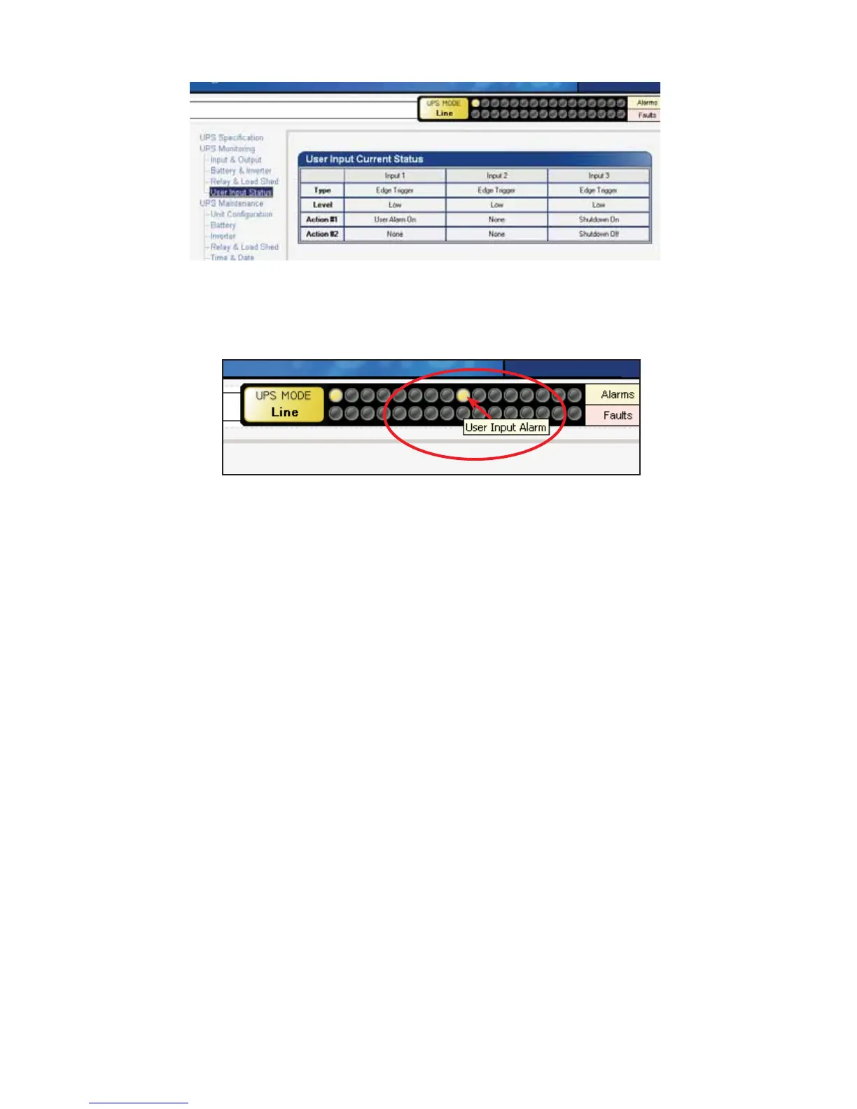 7. Check the User Input Current Status at the UPS Monitoring > User Input Status page.