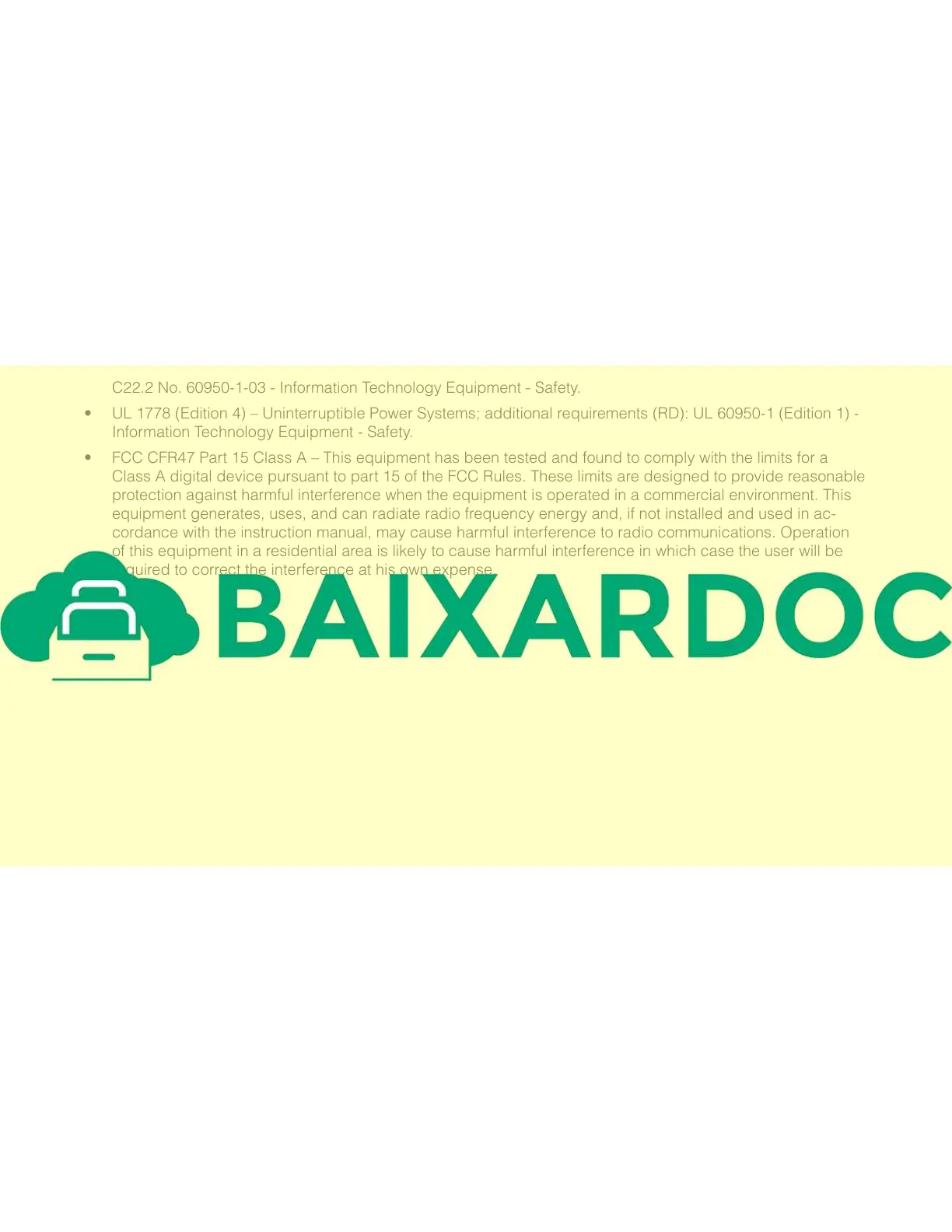 •UL 1778 (Edition 4) – Uninterruptible Power Systems; additional requirements (RD): UL 60950-1 (Edition 1) -
