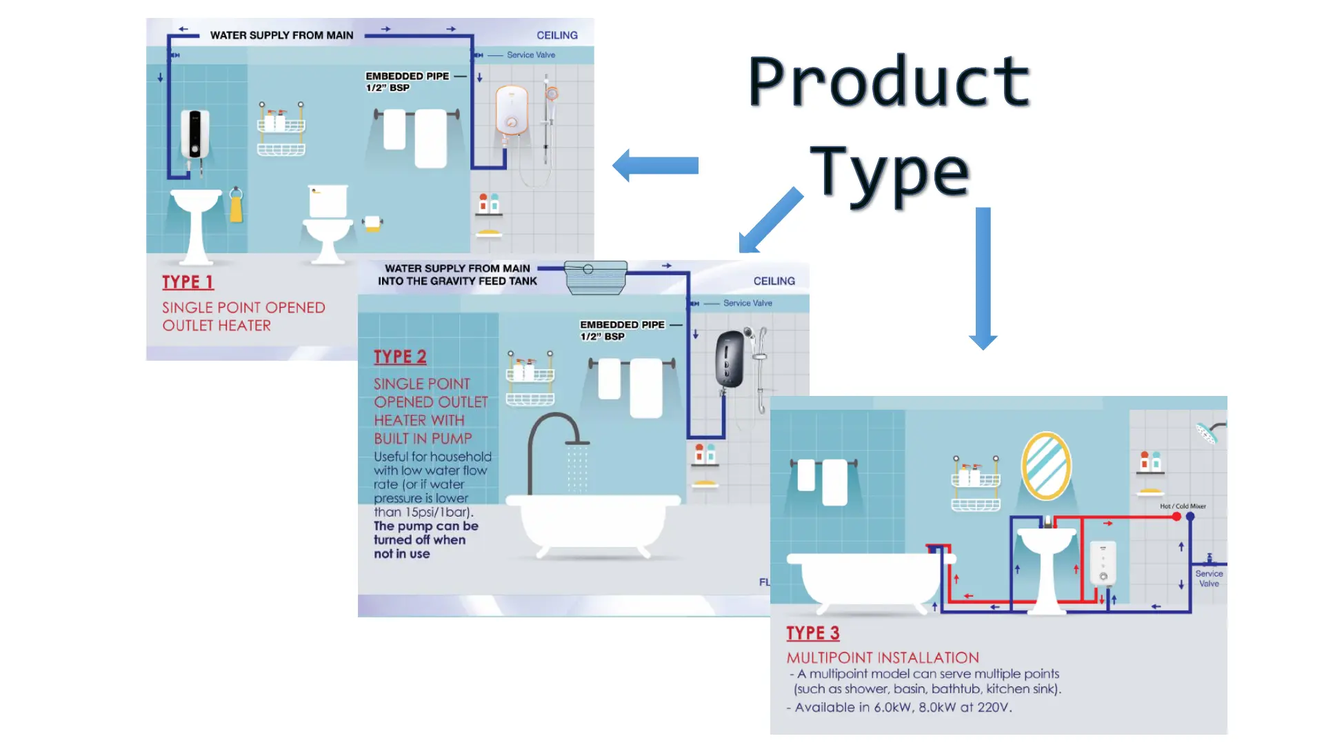 Alpha MULTIPOINT Series - Product Types and Applications; Type 1: Single Point Opened Outlet Heater; Type 2: Single Point Heater with Built-in Pump; Type 3: Multipoint Installation System
