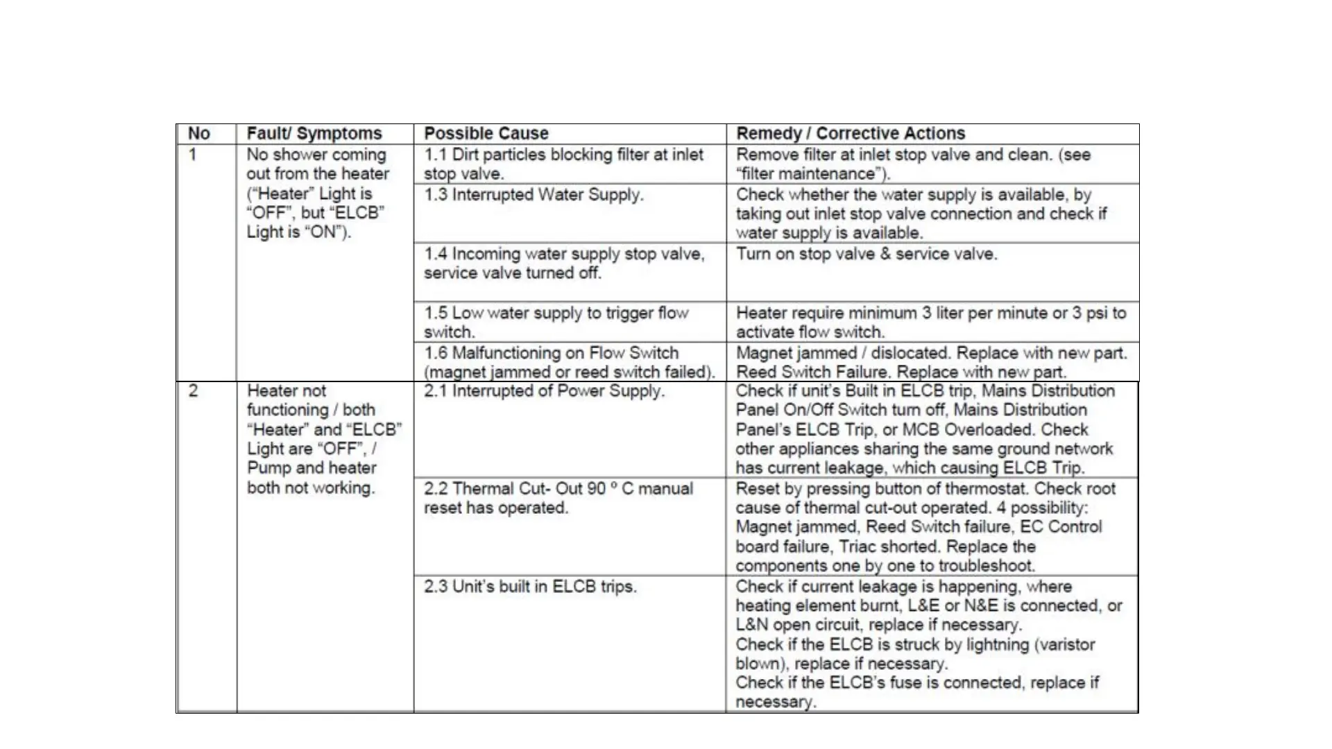 Alpha MULTIPOINT Series - Troubleshooting: No Shower or ELCB Issues; Diagnosing No Water Flow or ELCB Tripping