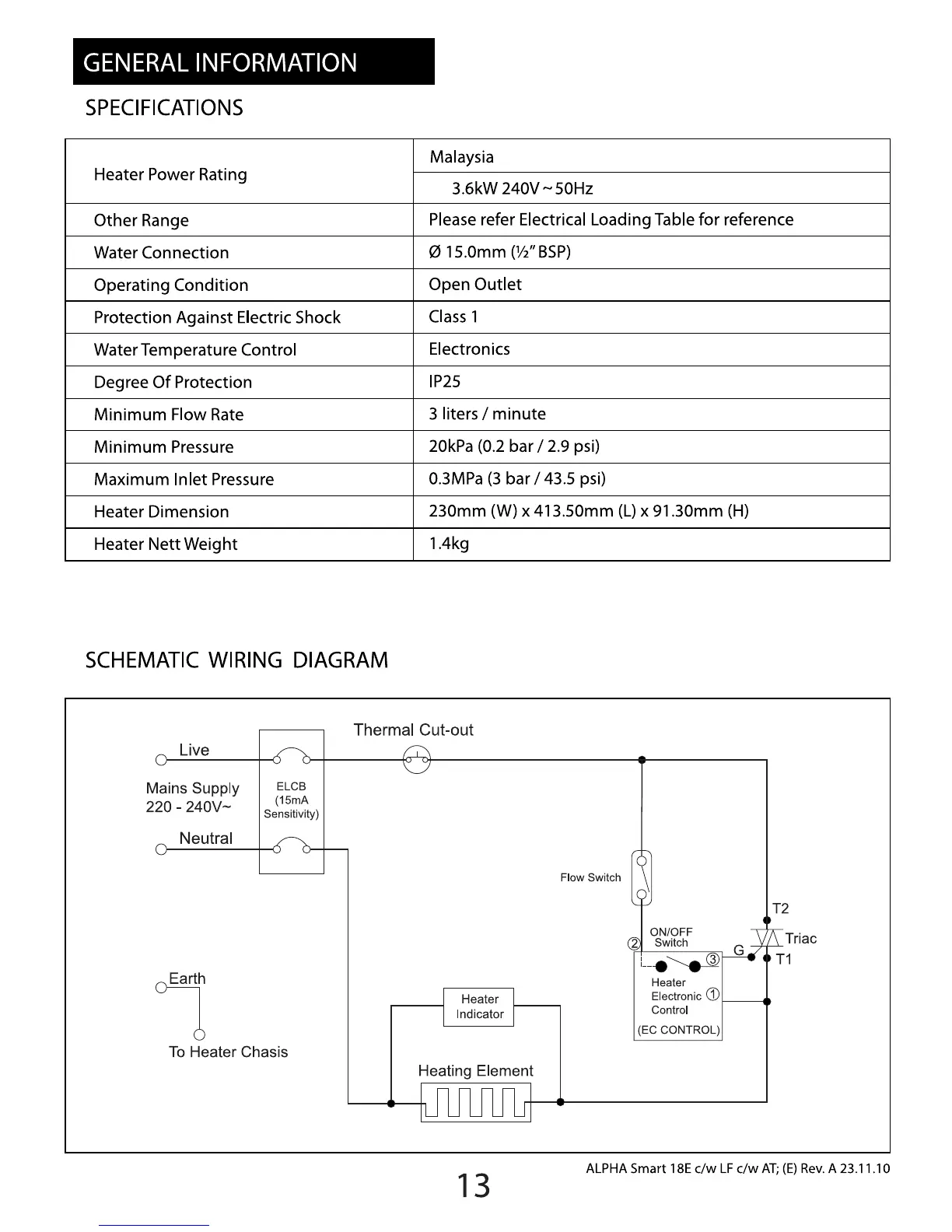 Alpha Smart 18E - Specifications and Wiring Diagram; Heater Specifications; Schematic Wiring Diagram