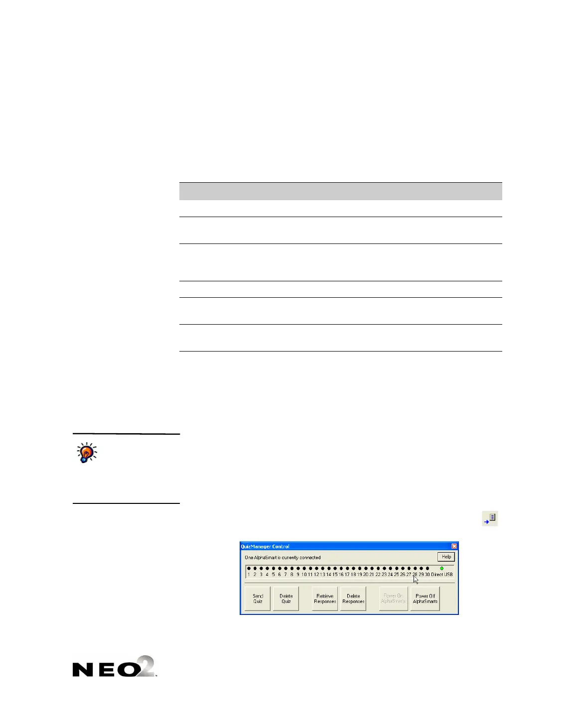 • Yellow means a NEO is connected, but it does not have the AlphaQuiz
