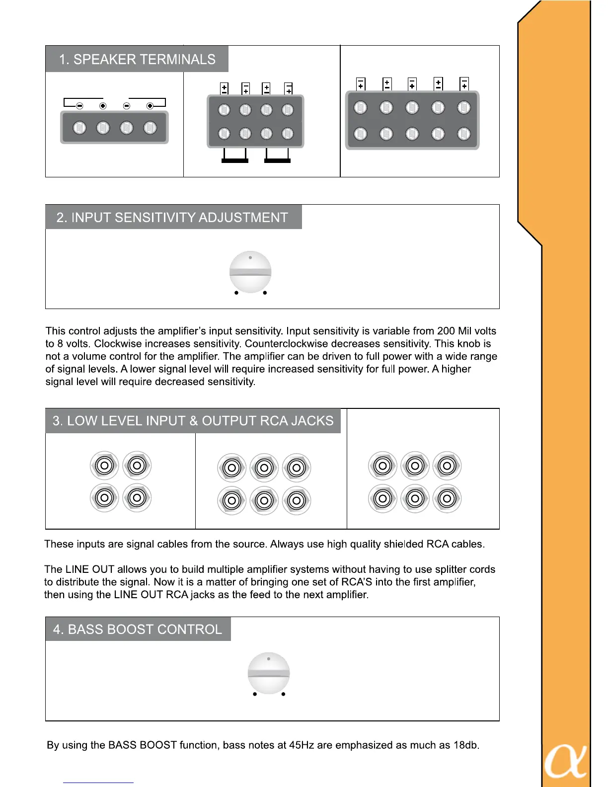 Alphasonik PM12005E - Low Level Input & Output RCA Jacks; Bass Boost Control; Input Sensitivity Adjustment; Speaker Terminals