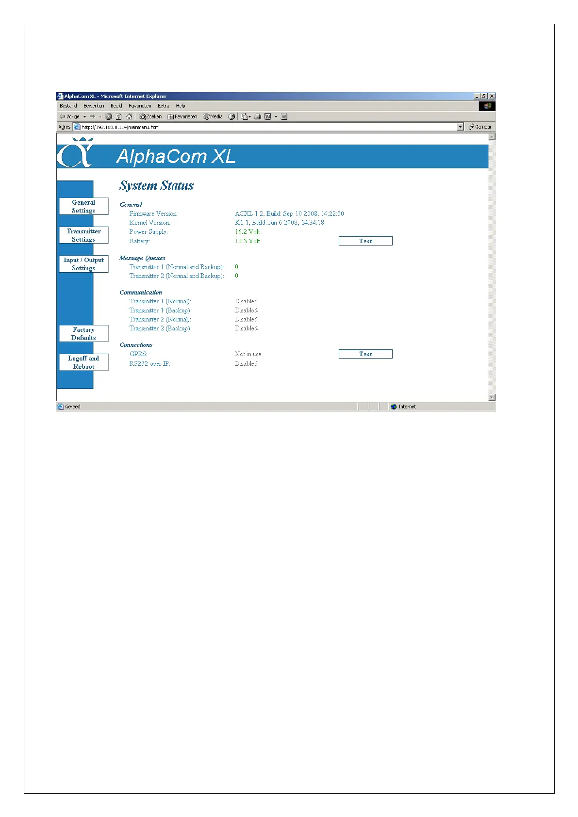 After you have logged in as the supervisor (admin) a status menu will appear on your screen. In the status