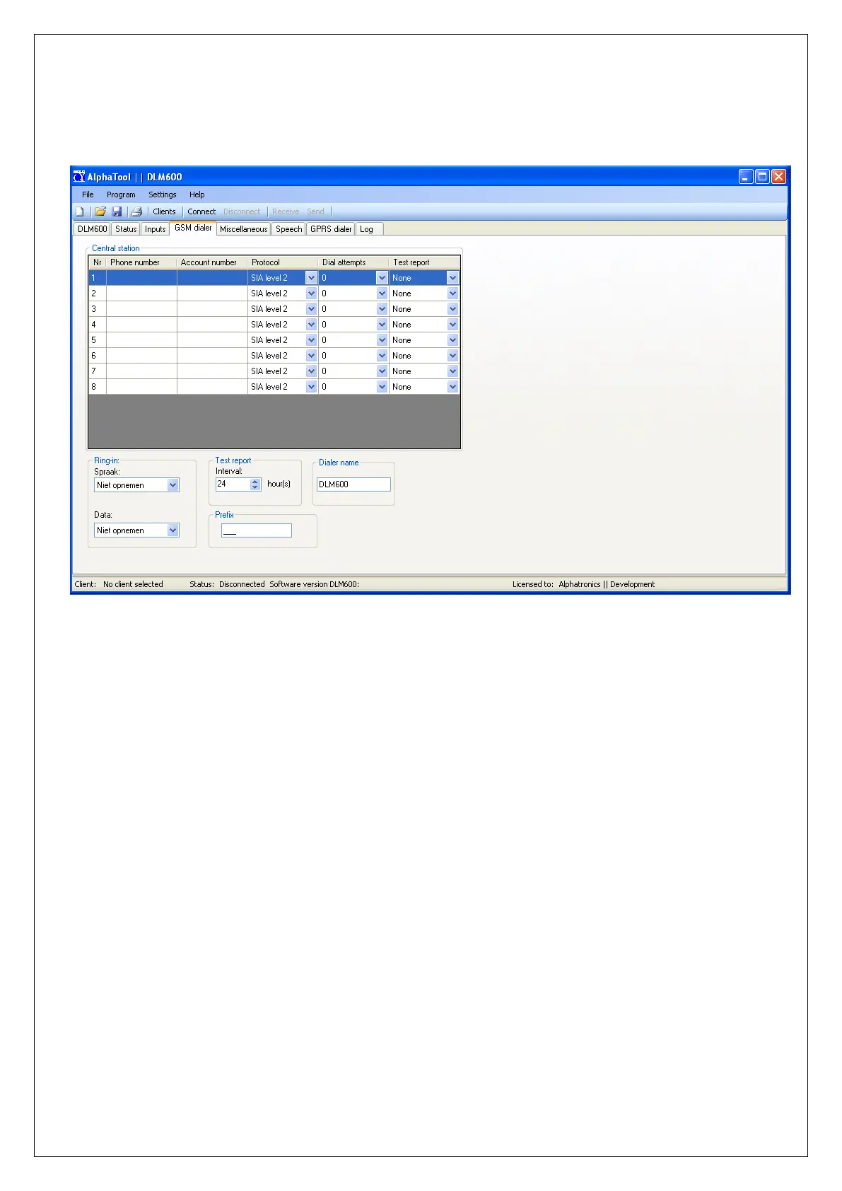 Here, the desired protocol (per telephone number) can be programmed. If the DLM-600 reports to a