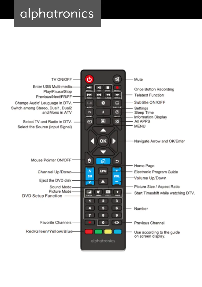 alphatronics SLA DSBAI+ Series - Remote Control Functions; Power, Media, and Navigation Controls; Audio, Subtitle, and System Settings; Channel, Volume, and Input Selection