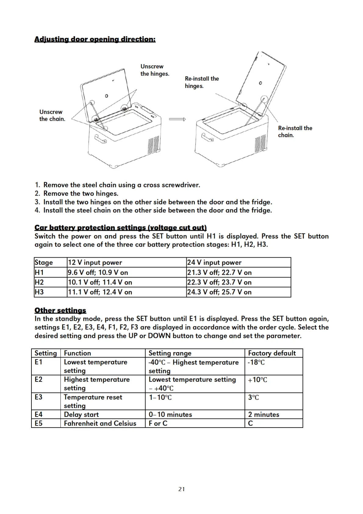 ALPICOOL ALC20 - Adjusting Door Opening Direction; Configuration and Settings; Car Battery Protection Settings; Other Settings