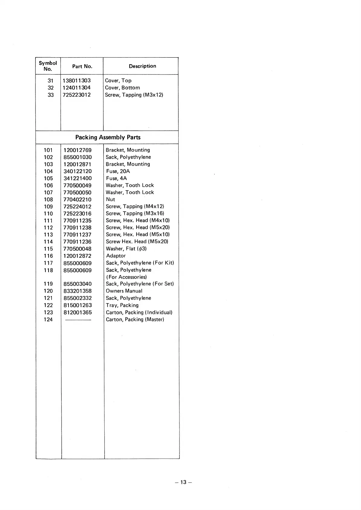 Alpine 3002 - Parts List - Packing; Packing Assembly Parts List