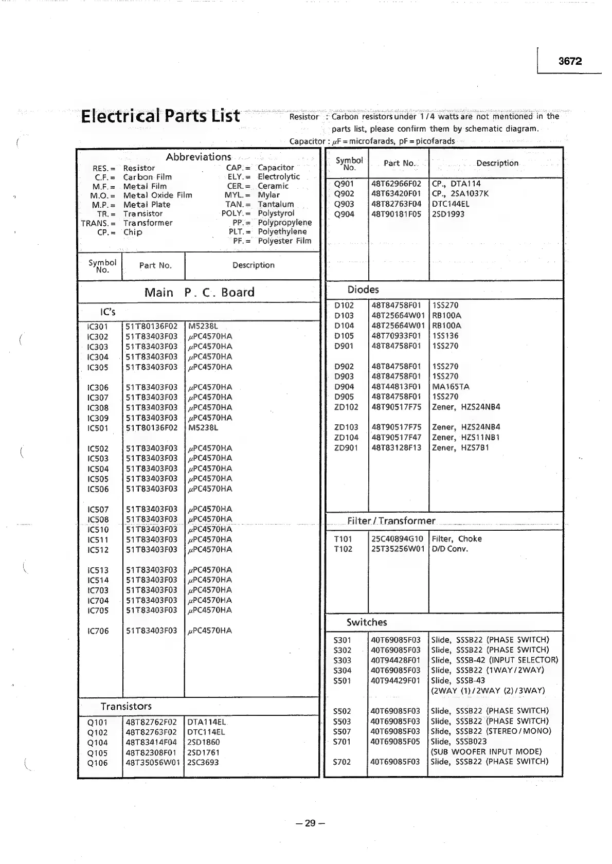 Alpine 3672 - Electrical Parts List; IC, Transistor, Diode, Filter, Switch Part Numbers
