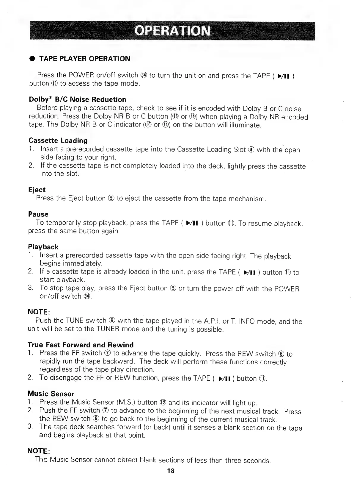 Alpine 7294R - Tape Player Operation; Cassette Loading; Music Sensor