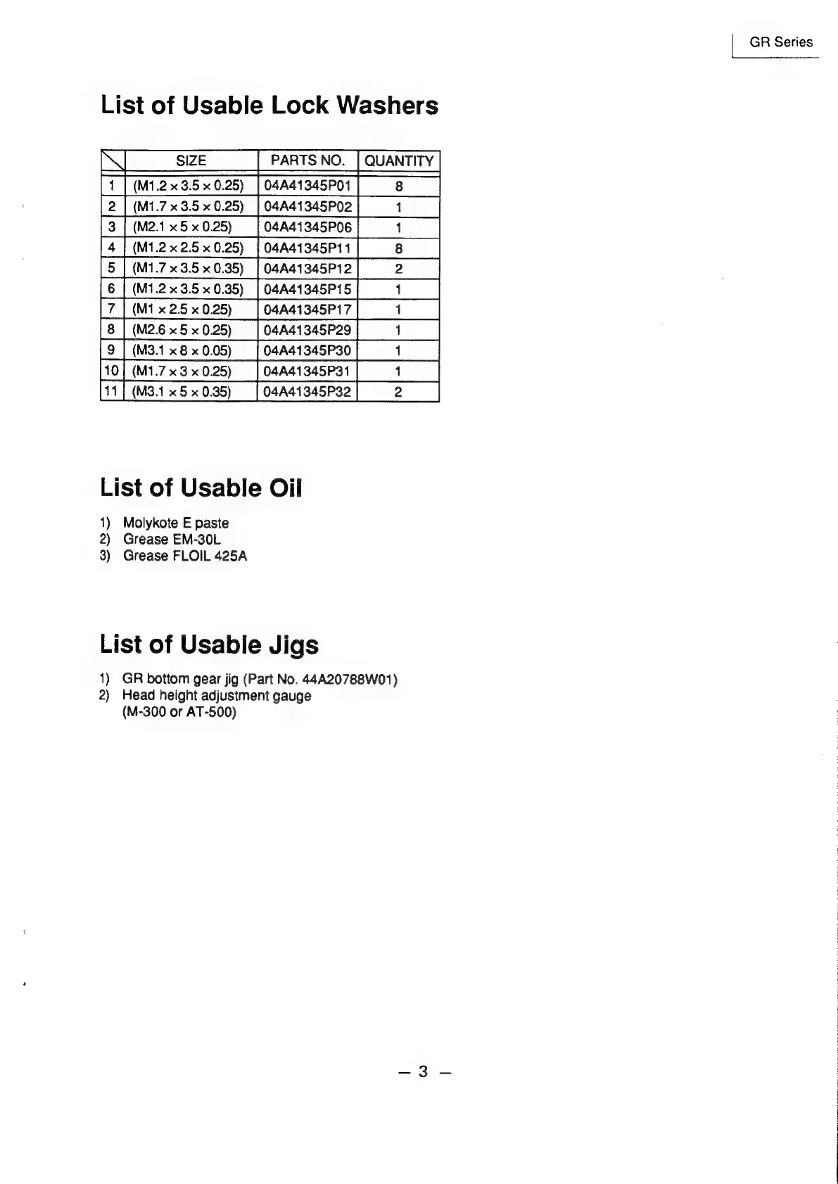 Alpine 7390M - GR Series Addendum Parts Lists; List of Usable Lock Washers; List of Usable Oil; List of Usable Jigs