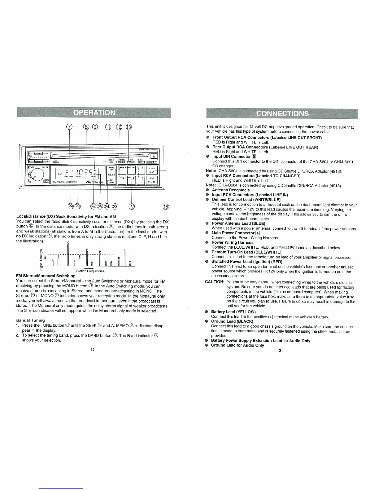 Alpine 7909 - OPERATION; Tuner Operation Details; CONNECTIONS; Wiring Harness and Connectors