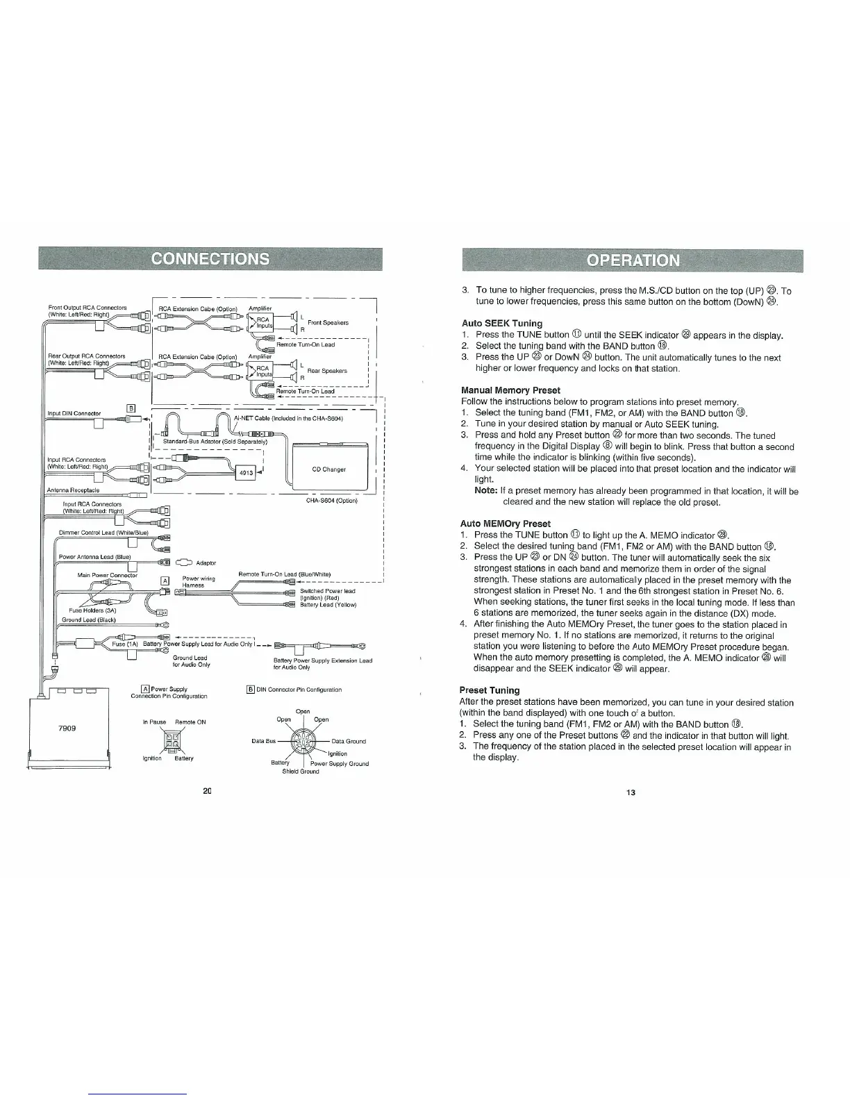 Alpine 7909 - CONNECTIONS; Connector Pin Configurations; OPERATION; Radio Tuning Methods