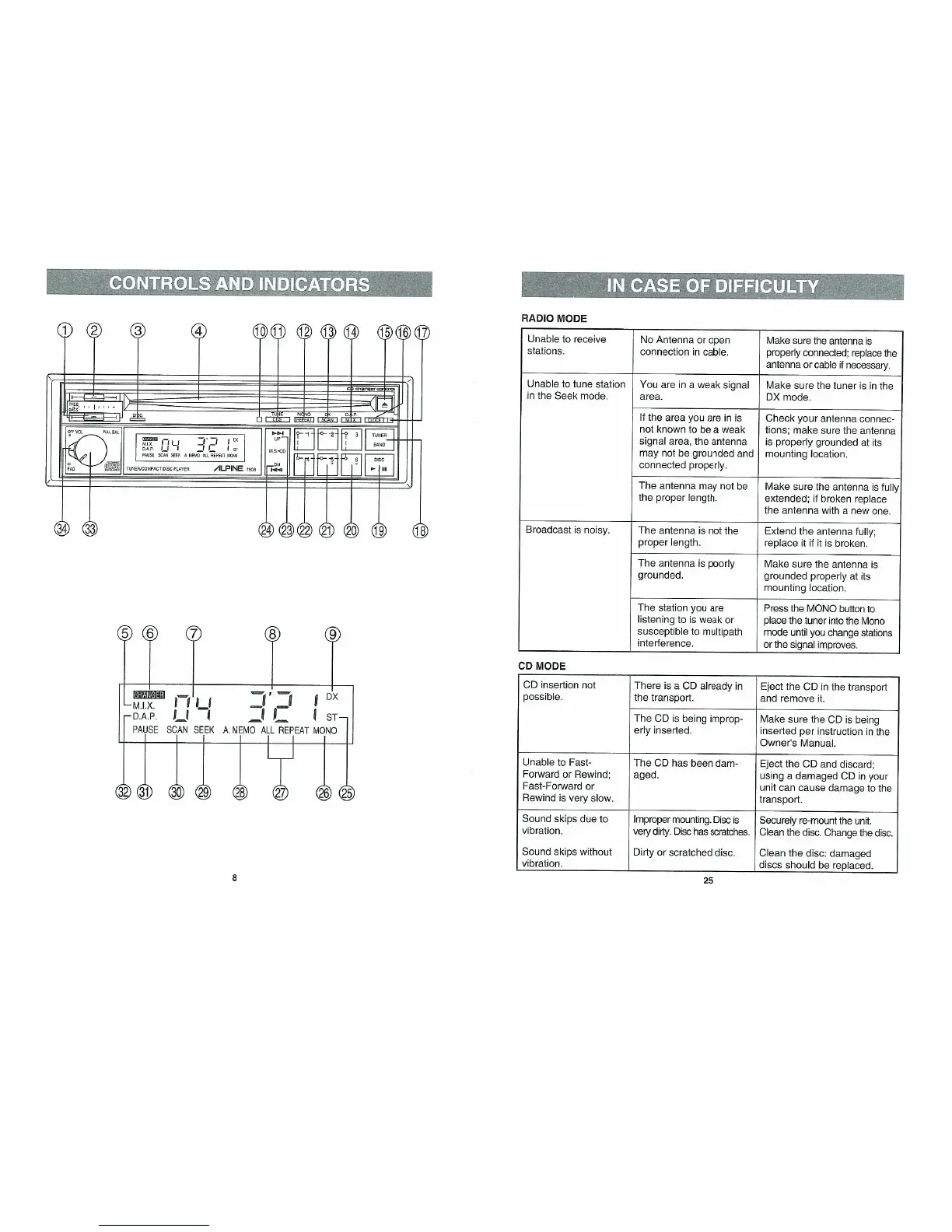 Alpine 7909 - CONTROLS AND INDICATORS; Control Panel Layout; IN CASE OF DIFFICULTY; Radio and CD Troubleshooting