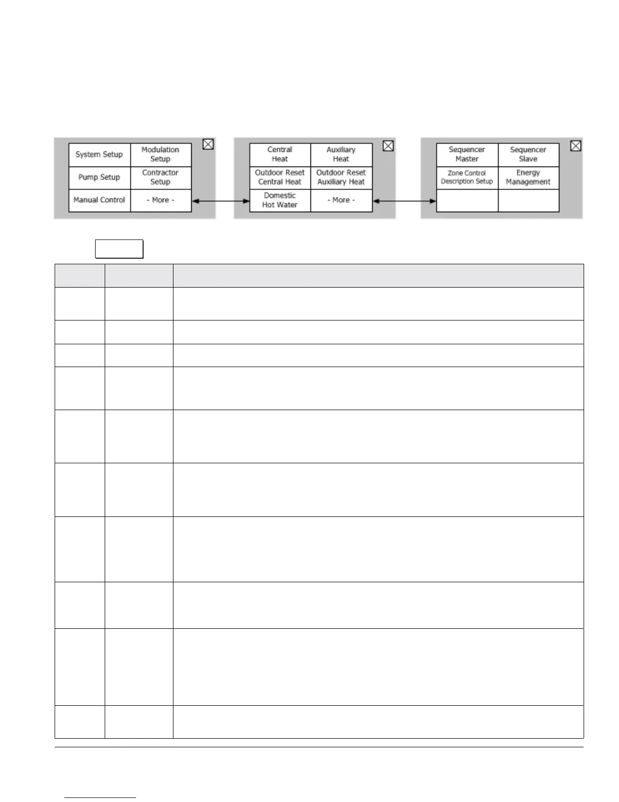 “Modulation”, “Auxiliary Heat” and “Zone Control Description Setup” menus. This feature allows these