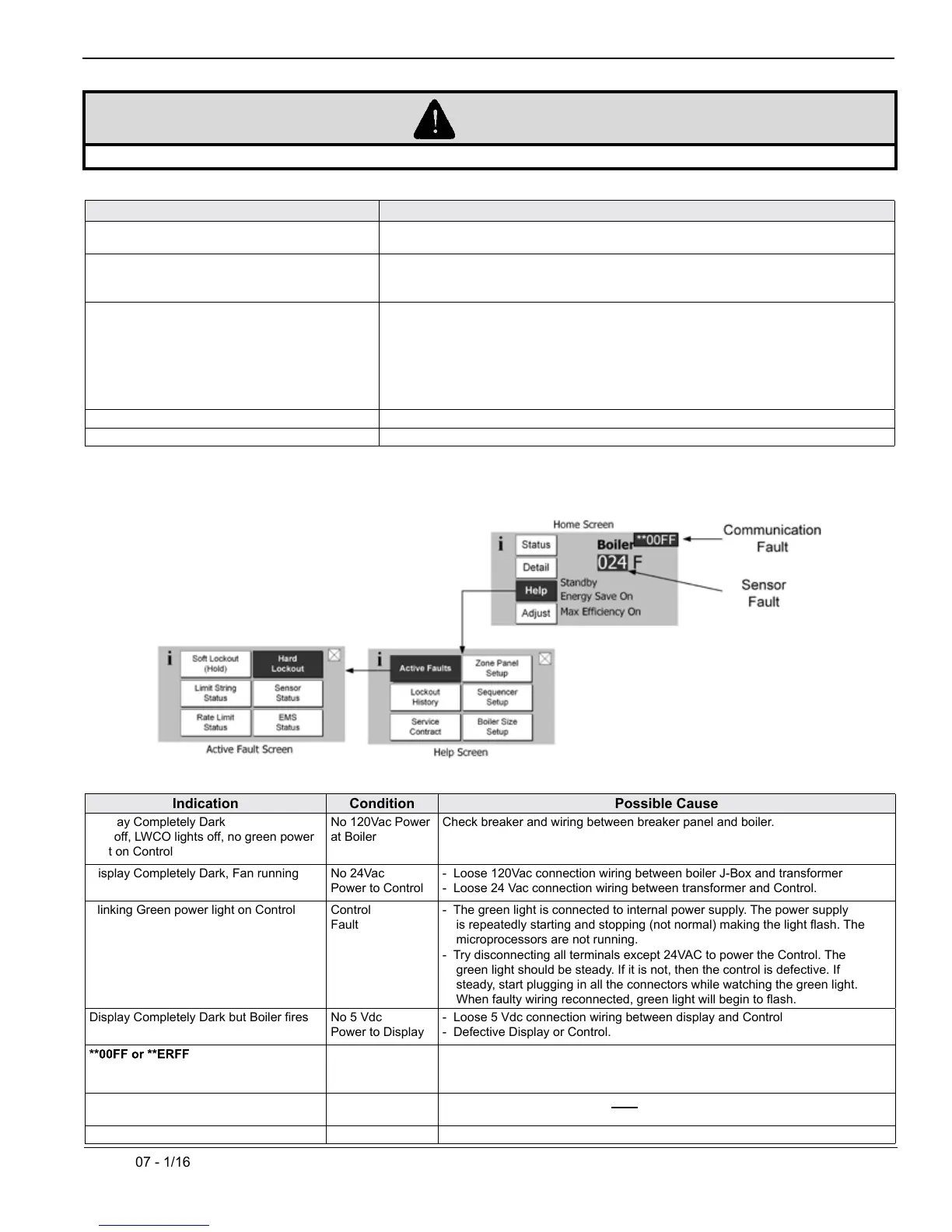 Faults are investigated by selecting the “Help” button from the “Home” screen. When a fault is active the “Help” button ashes