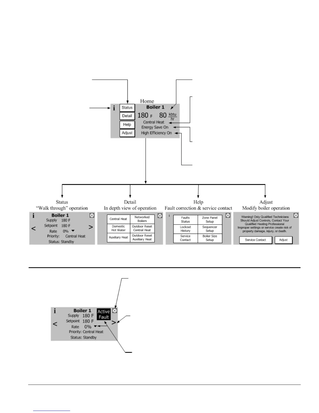The Control includes a touch screen LCD display. The user monitors and adjusts boiler operation by selecting screen