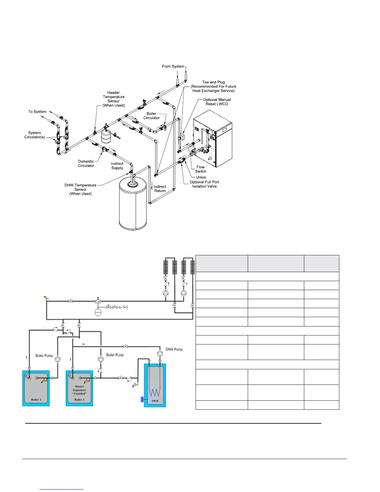 Make sure indirect water heater and DHW pump are sized to maintain ow though boiler within limits shown in Table 12.