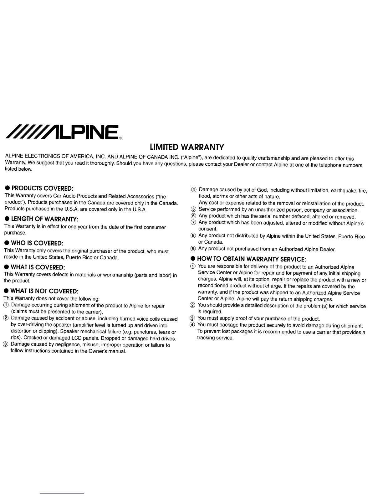 Warranty. We suggest that you read it thoroughly. Should you have any questions, please contact your Dealer or contact Alpine at one of the telephone numbers