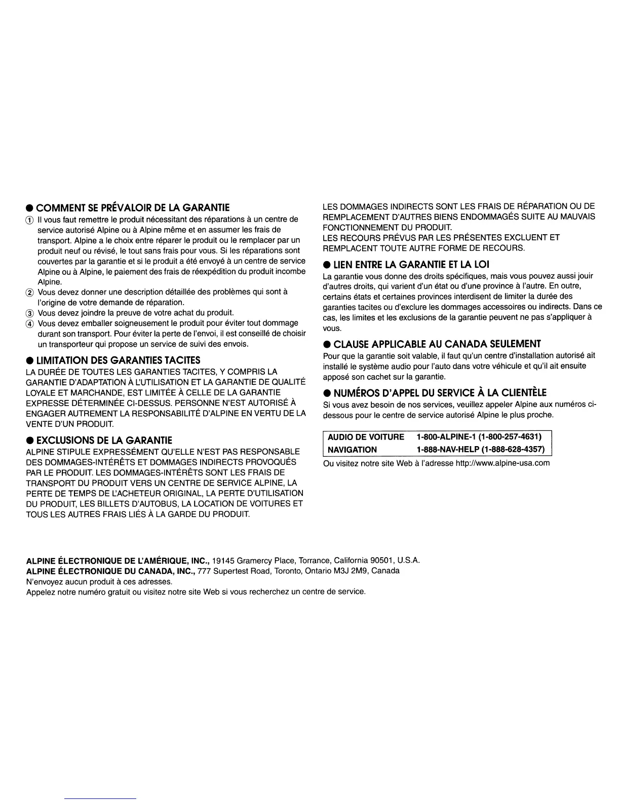 AUDIO DE VOITURE 1-800-ALPINE-1 (1-800-257-4631)