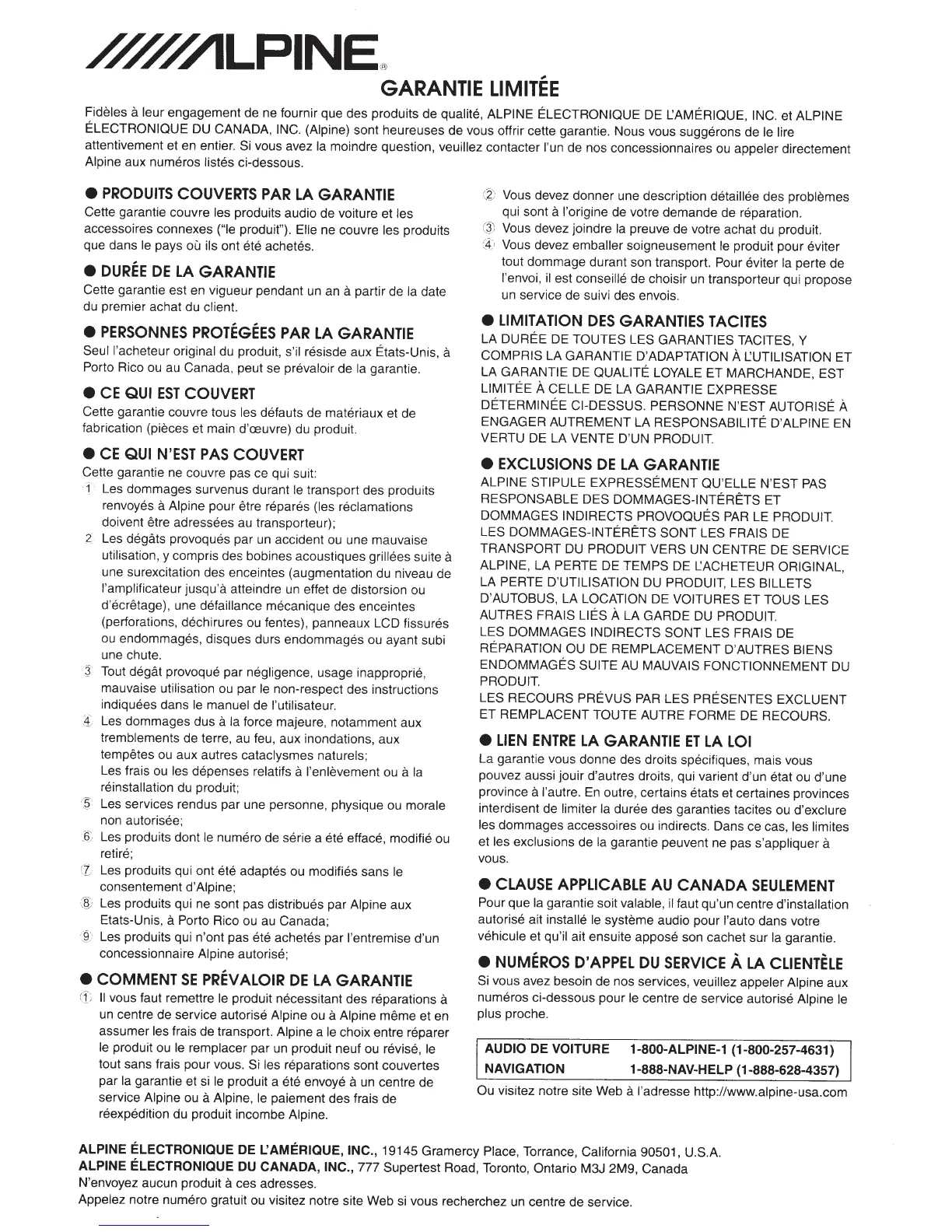 VOITURE 1-800-ALPINE-1 (1-800-257-4631)