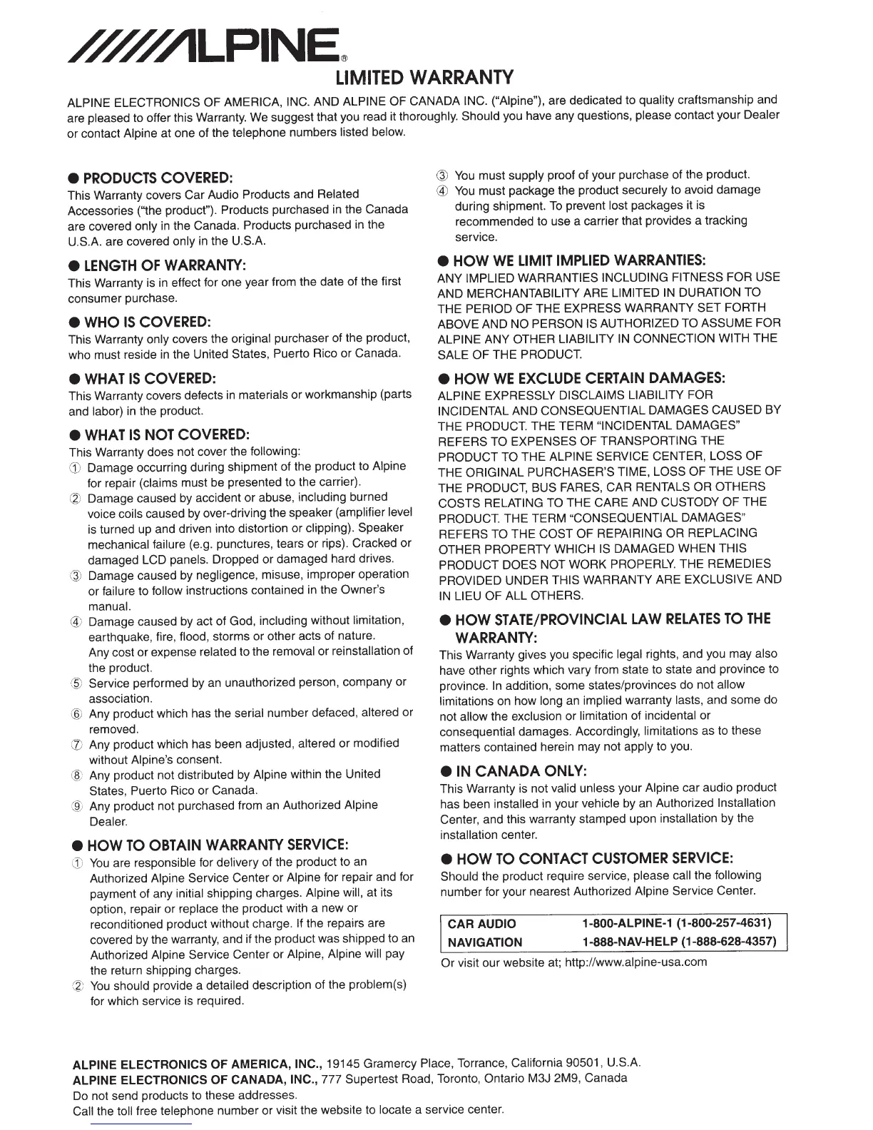 number for your nearest Authorized Alpine