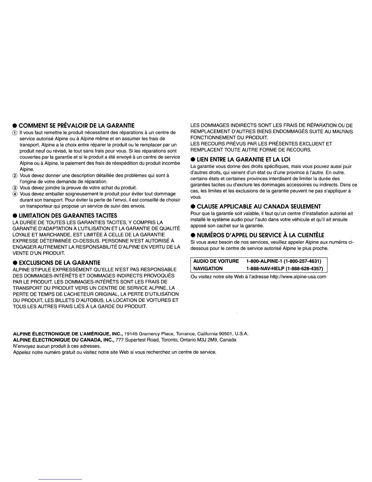 AUDIO DE VOITURE 1-800-ALPINE-1 (1-800-257-4631)