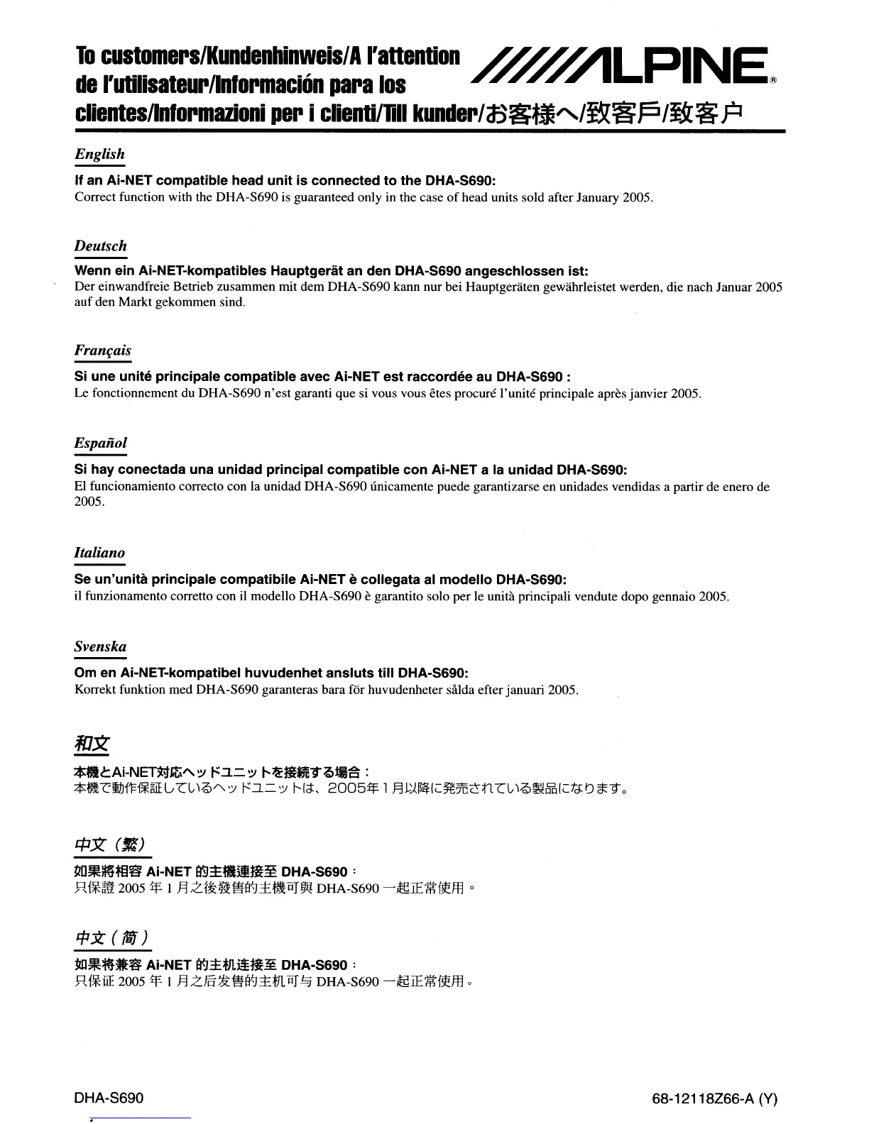 El funcionamiento correcto con la unidad DHA-S690 unicamente puede garantizarse en unidades vendidas a partir de enero de