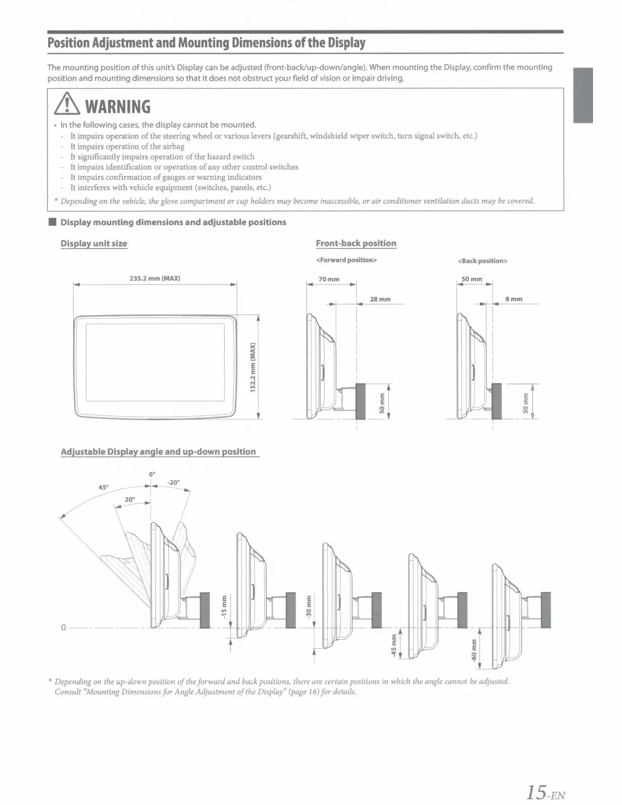 this unit's Display can be adjusted (front-back/up-down/angle). When mounting the Display, confirm the mounting