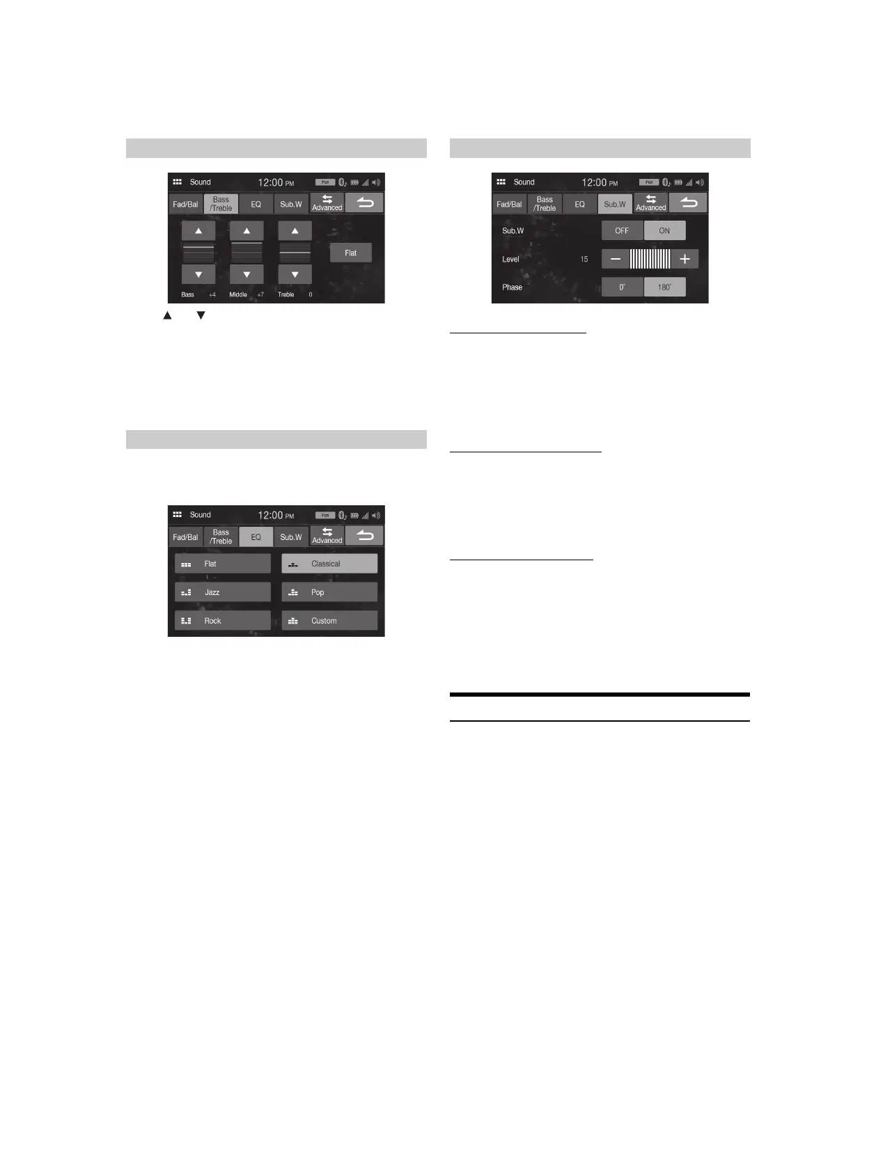 • To reset the initial setting (Bass: 0, Middle: 0, Treble: 0), touch [Flat].