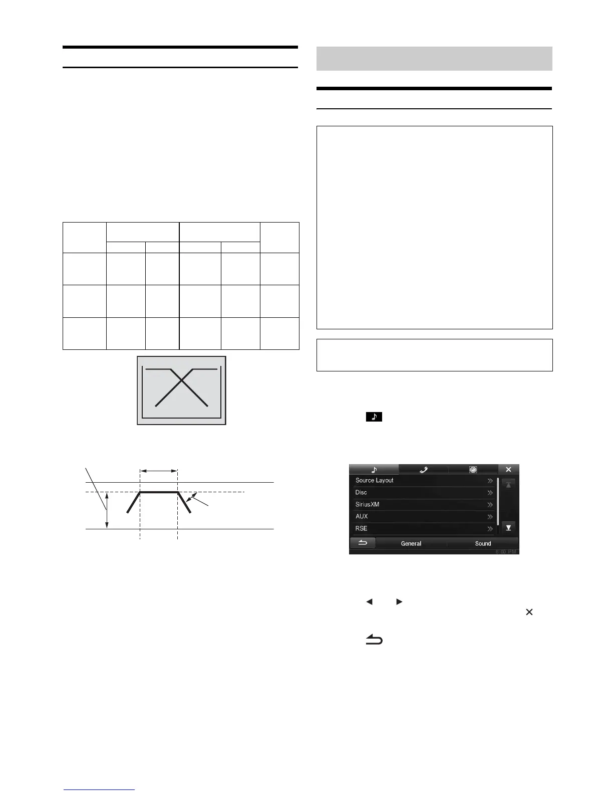 Setting items: Source Layout / Disc / SiriusXM / AUX / RSE /