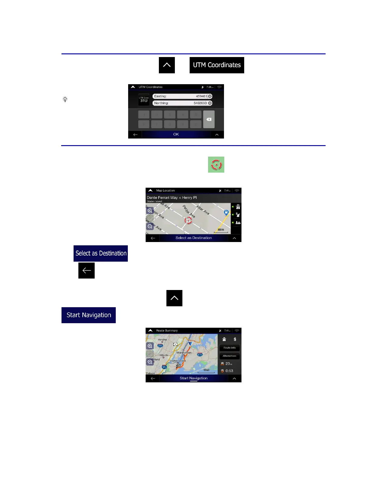 information and route alternatives. Tap to modify the route parameters, or tap