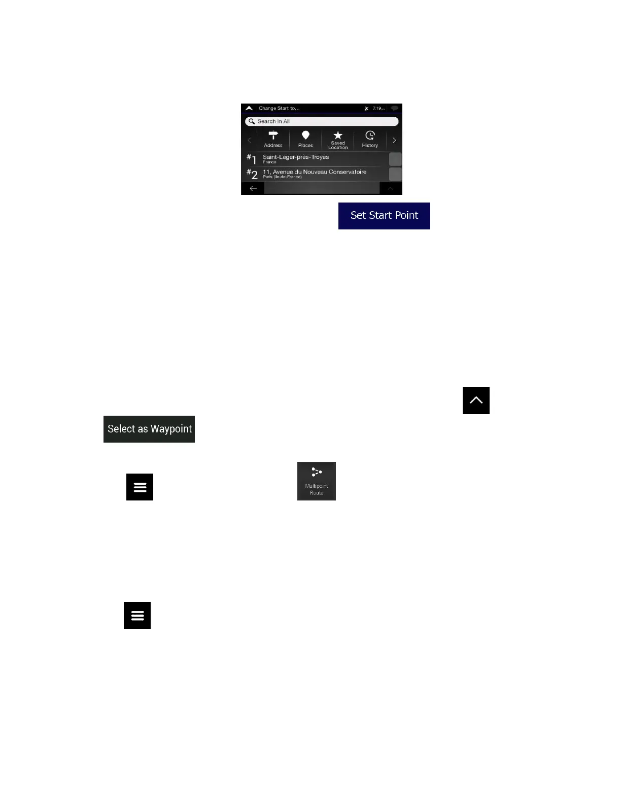 • Tap on the Navigation view and tap . Add a destination to your route as described