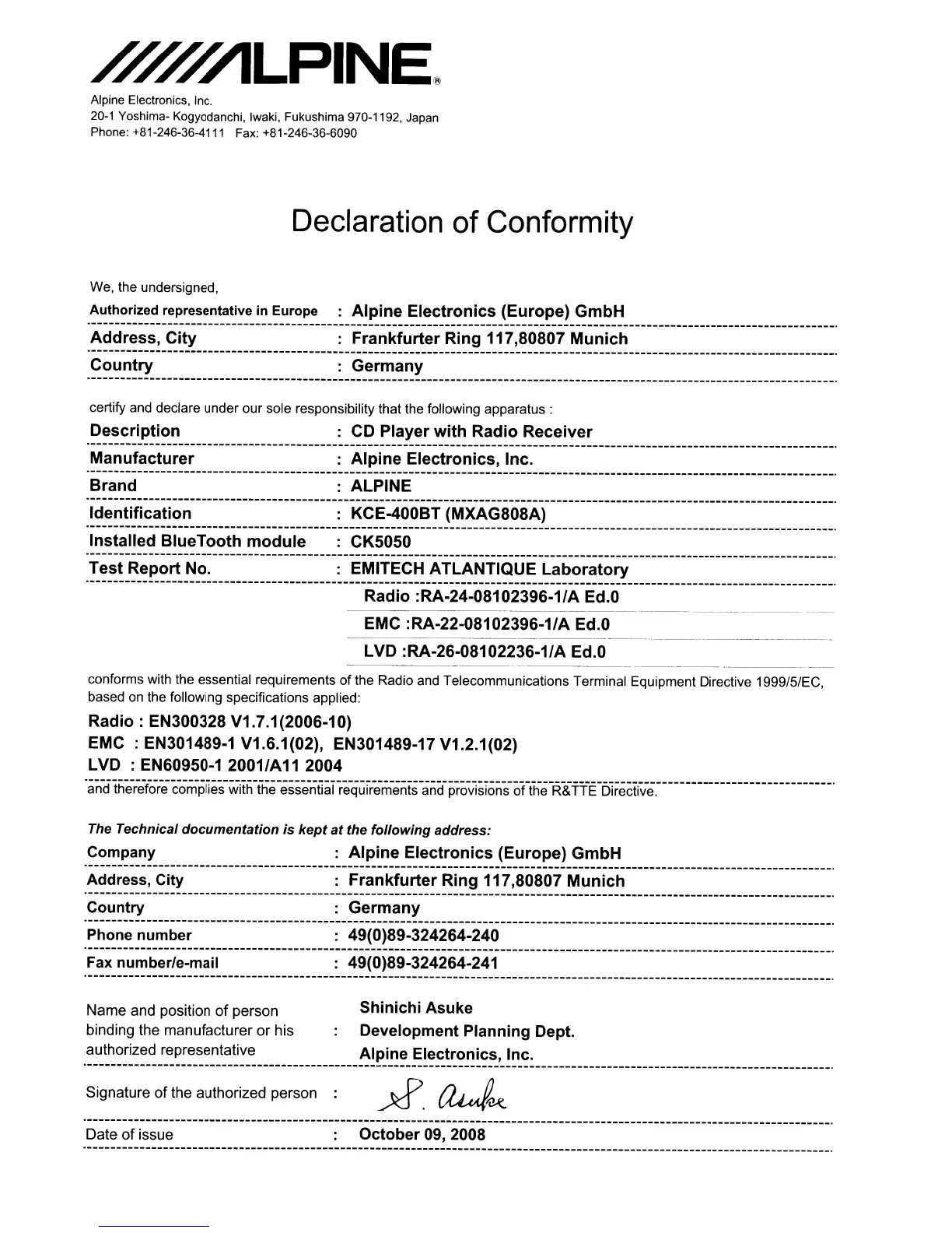 Authorized representative in Europe : Alpine Electronics (Europe) GmbH