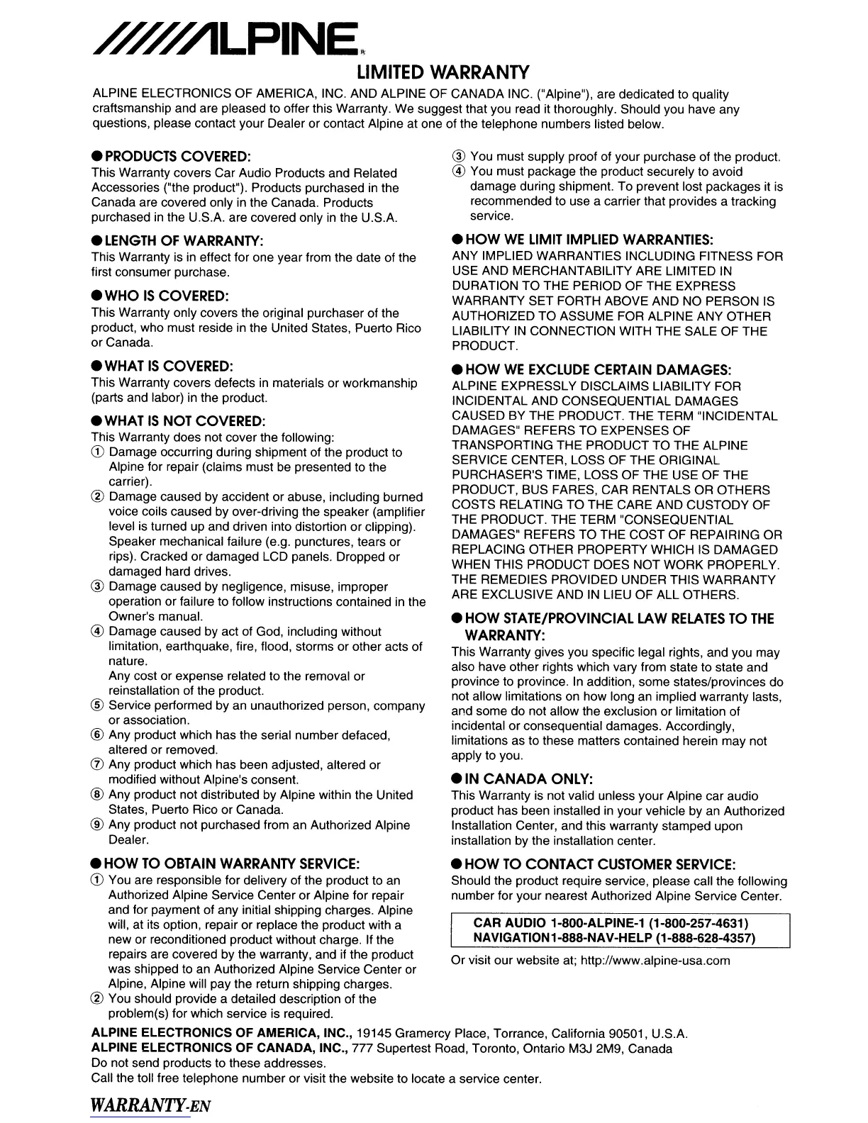 CAR AUDIO 1-800-ALPINE-1 (1-800-257-4631)