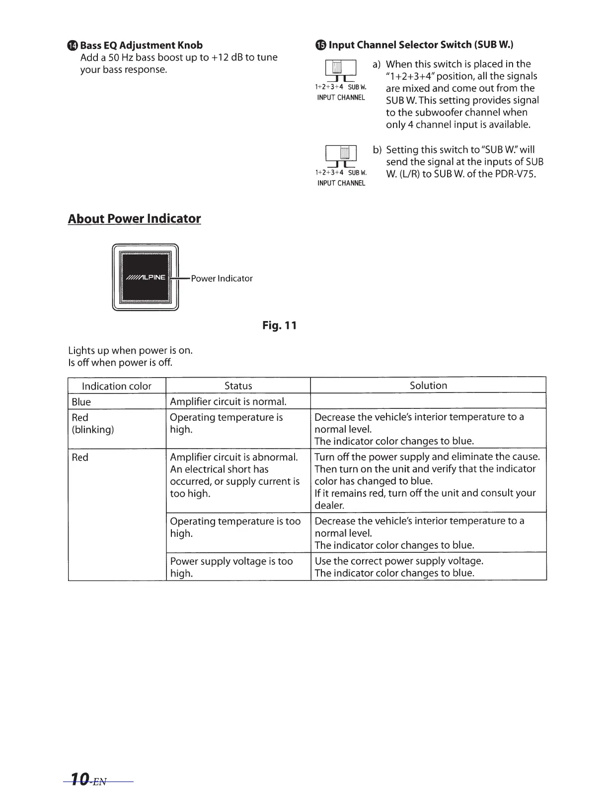 Alpine PDR-V75 - Bass EQ and Power Indicator; Bass EQ Adjustment; Power Indicator Status