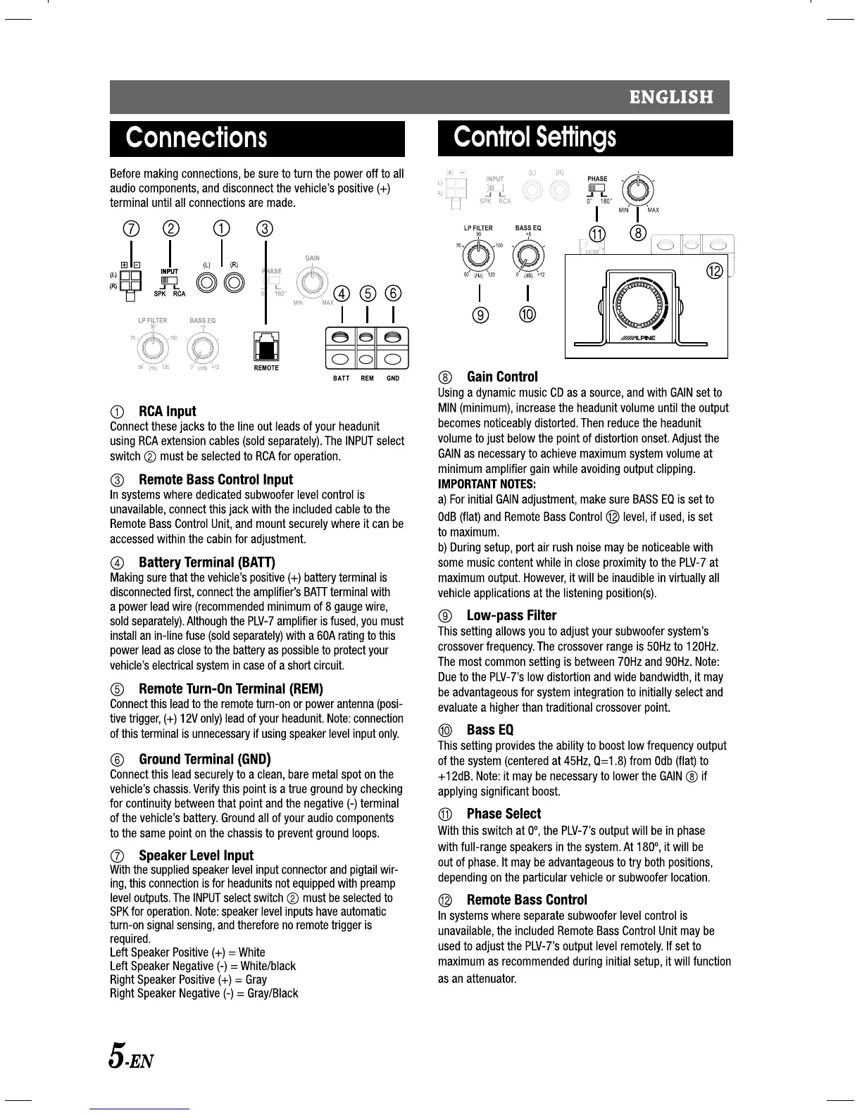 Alpine PLV-7 - Connections; Control Settings