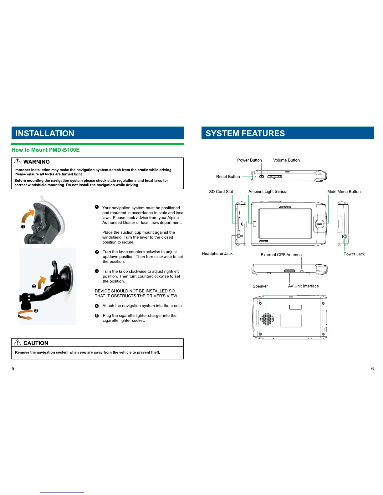 Alpine PMD-B100E - INSTALLATION; Mounting the Navigation System; SYSTEM FEATURES